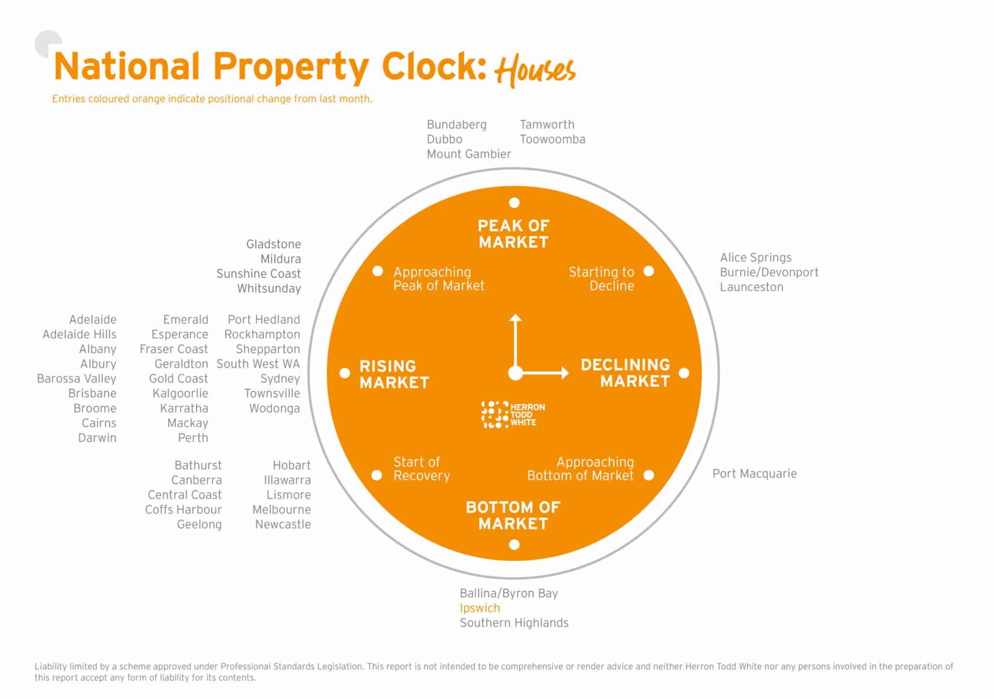 Each month, independent property valuation firm Herron Todd White (HTW) publishes a residential property report that assesses the performance of Australia’s 50 largest markets. HTW’s Property Clock grades each market based on current and predicted performance to determine whether it’s rising, falling, peaking or bottoming out.
